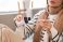 • Sick young woman pouring cough syrup into spoon at home, closeup