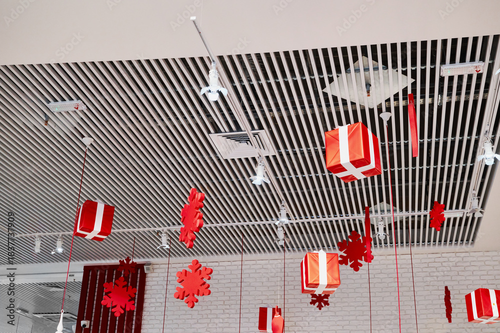 • Christmas decorations featuring red gift boxes and snowflake ornaments hanging from modern white ceiling