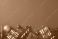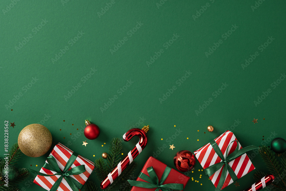• A festive holiday display with striped gifts, candy cane, gold ball, pine sprig and confetti evokes Christmas and New Year celebration on a green background