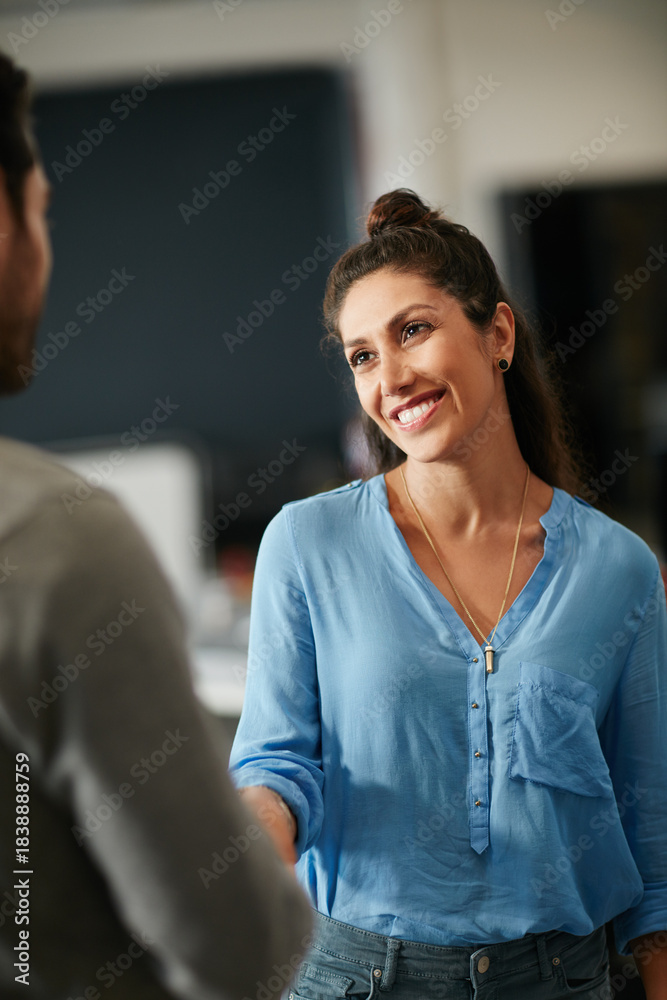 Warzywa - Smile, meeting and business people with handshake in interview for recruitment, deal or welcome.... #1838888759