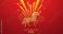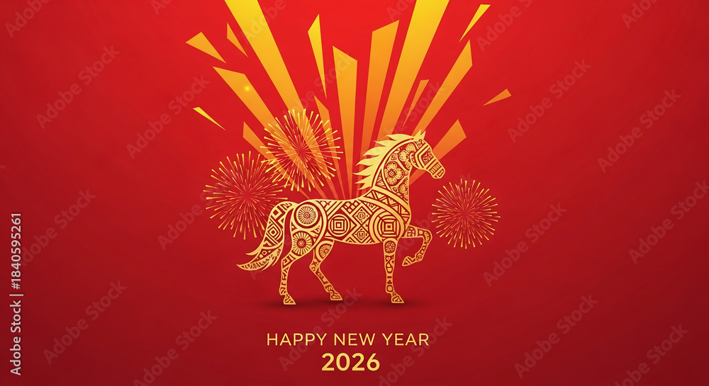 • Golden decorative horse on red background with fireworks, celebrating the year 2026 for the New Year, symbolizing prosperity and good fortune