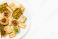 • Traditional oriental sweets in white plate with different nuts on a white table, top view, copy space