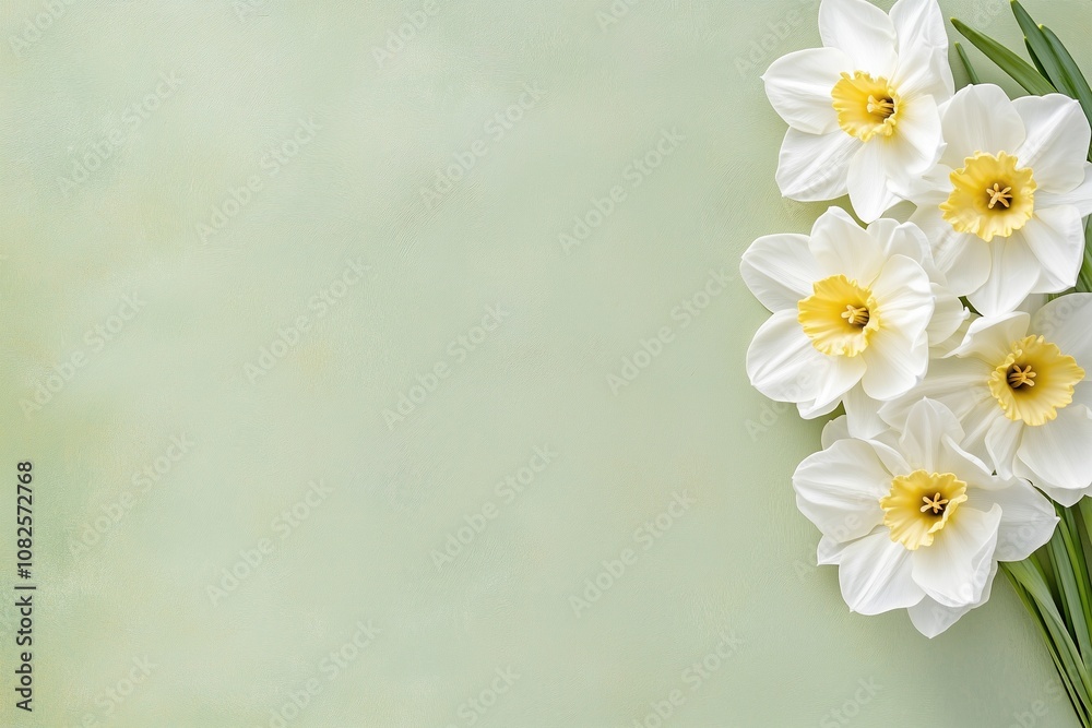 Kwiaty - Minimalistic Easter background with white daffodil flowers on on the board with copy space on the... #1082572768
