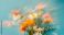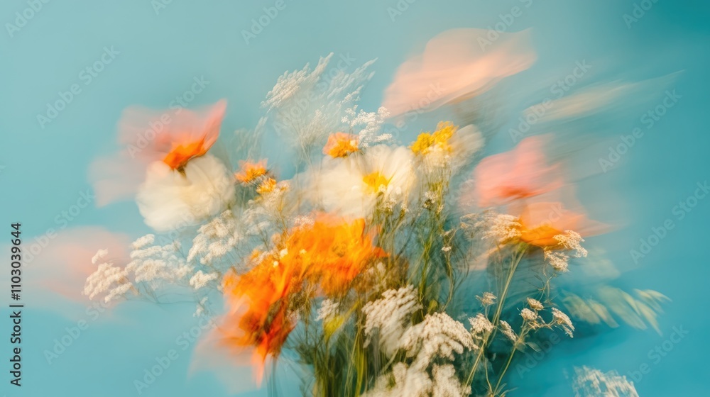 • Vibrant bouquet of flowers in motion with a soft-focus effect, set against a serene blue background creating an artistic and dreamy atmosphere.