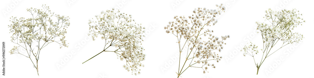 • Delicate clusters of small white baby breath flowers arranged in various positions.
