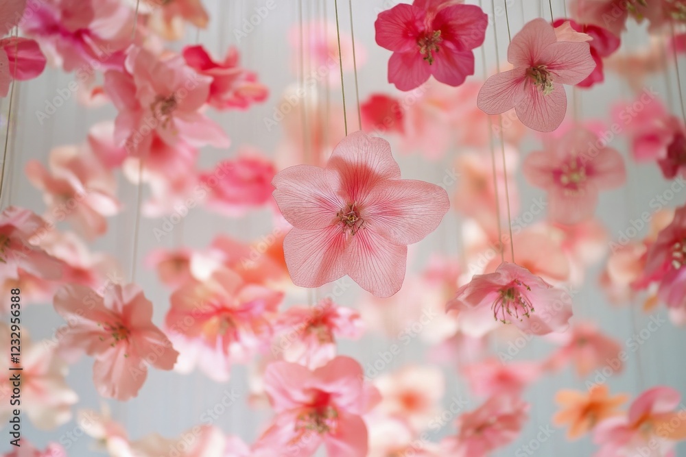 Kwiaty - Beautiful display of hanging pink flowers creating a serene atmosphere in a bright indoor space #1232956388