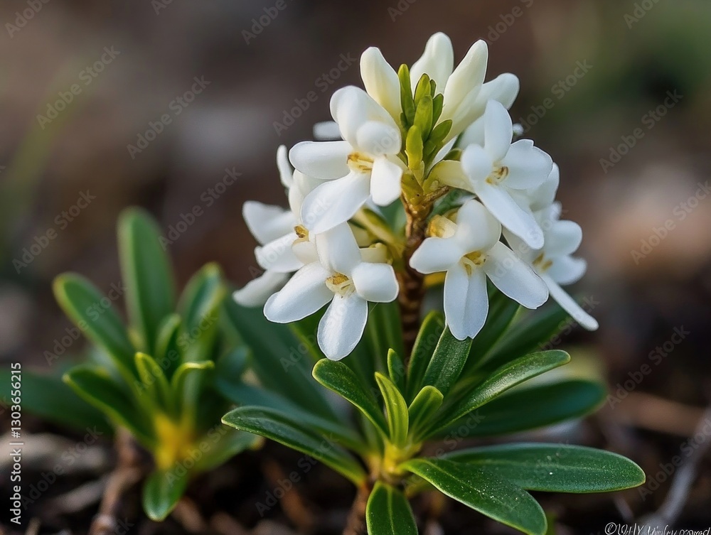 • blooming Daphne flower in early spring, its white petals deeply contrasted against a dark, earthy surroundings
