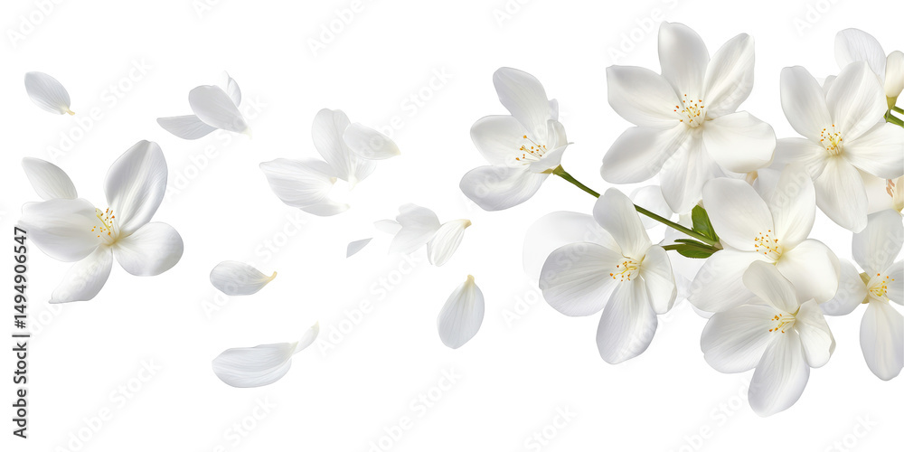 • Arrangement of white flowers with petals falling on a black background creating a delicate floral design