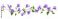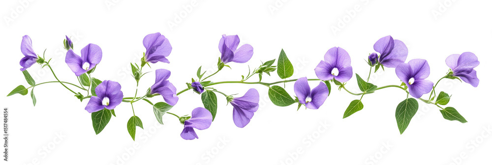 • Delicate purple flowers with green leaves arranged on a winding vine. Png, Transparent background.
