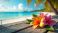 • Vibrant tropical flowers on wooden table. Beach background calm turquoise water, white sand. Vacation, travel, relaxation vibes. Sunny weather. Summer design, nature inspiration, coastal scenery,