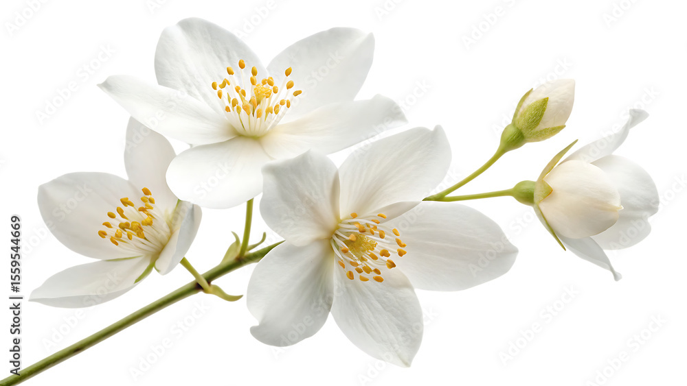 • Flying a beautiful white flower of jasmine falling isolated on a white background PNG. AI GENERATED.