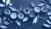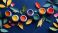 • Colorful paint containers arranged on a dark blue surface, surrounded by paper leaves and flowers