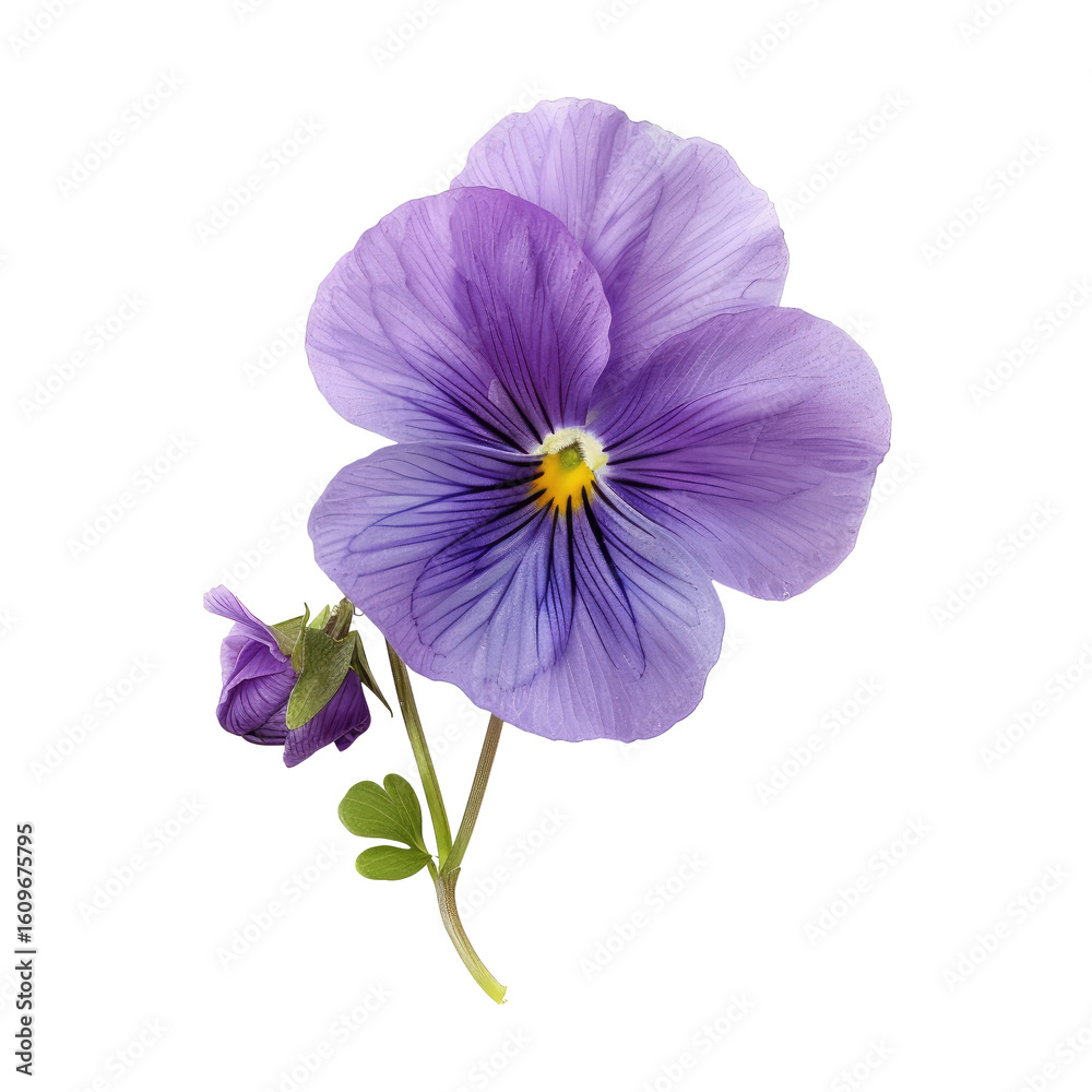 • Close-up of a vibrant purple pansy with delicate petals and a yellow center. Two small buds accompany the flower