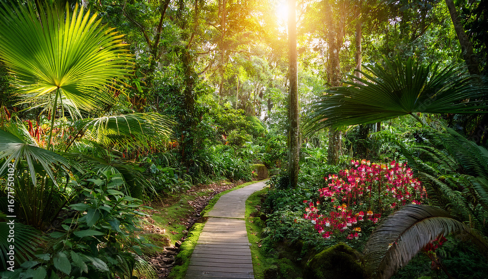 Kwiaty - a vibrant jungle path winds through lush greenery dappled sunlight filtering through the dense... #1671750102