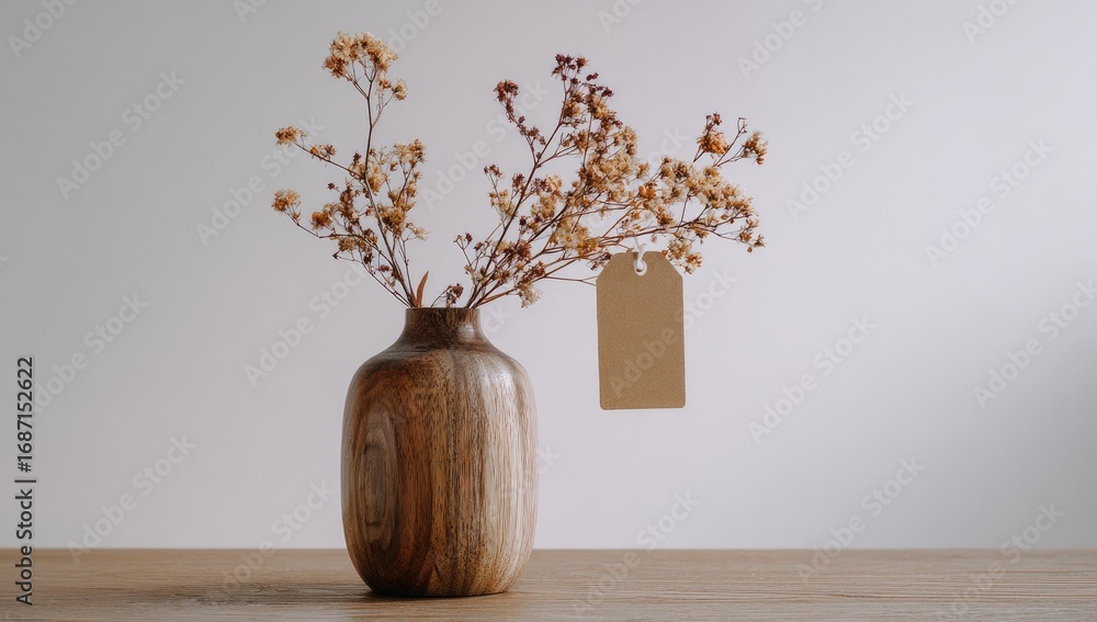 Kwiaty - A wooden vase with dried flowers and a tag #1687152622