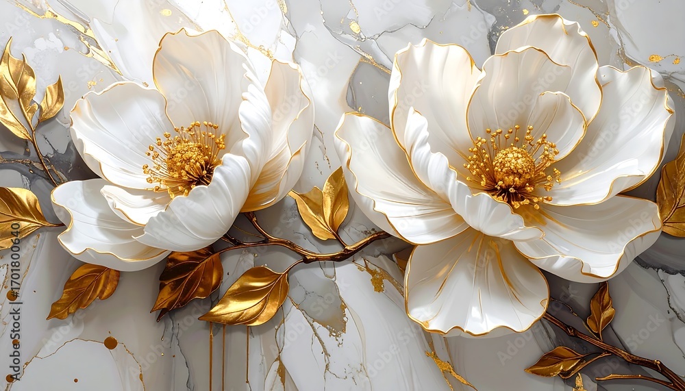 • Two opulent white flowers with gold accents, set against a grey and white marble background, showcase intricate detailing and a luxurious aesthetic.