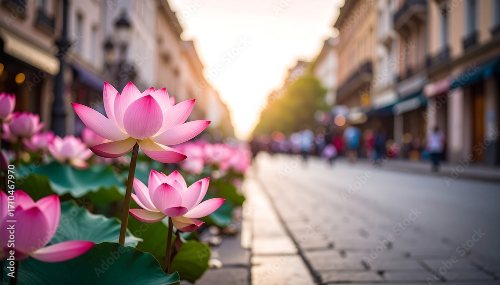 Kwiaty - Pink lotus flowers bloom on city street #1710467970