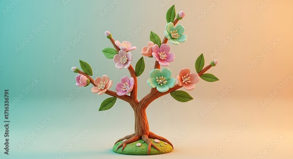 • A small clay tree with pink and blue flowers and green leaves on a gradient background