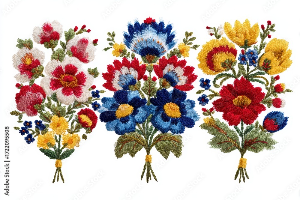 • Embroidered three bouquets of Ukrainian flowers featuring vibrant colors and intricate designs showcasing cultural craftsmanship and artistry