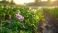 • A field of potato plants in bloom, showcasing vibrant purple flowers against a backdrop of lush greenery and soft, golden sunlight.
