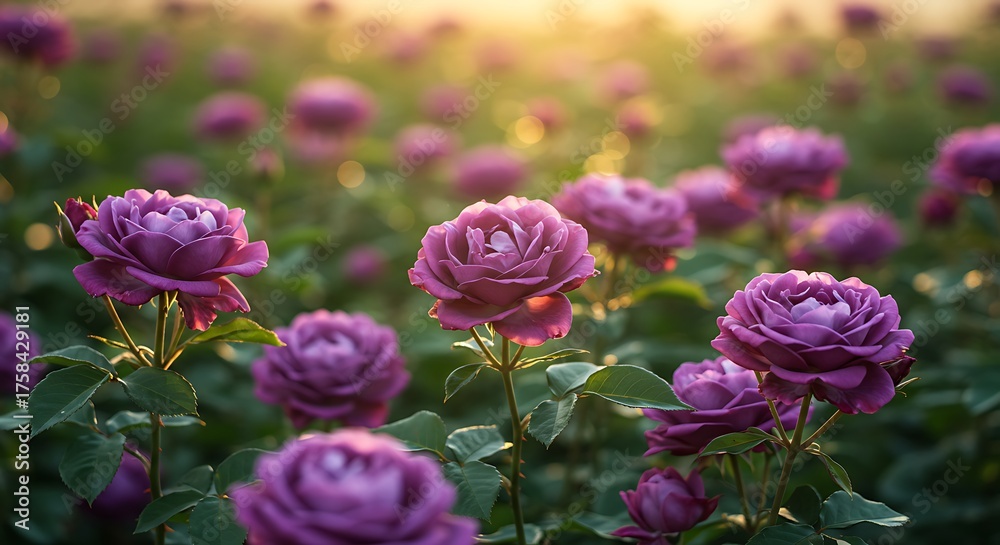 • Field of purple roses in full bloom with soft sunlight background