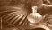 • A delicate pink perfume bottle nestled amongst lush green tropical leaves and delicate pink flowers