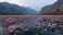 • Serene tranquil lake filled with blooming pink lotus flowers and floating green leaves under natural light with distant mountains and copy space