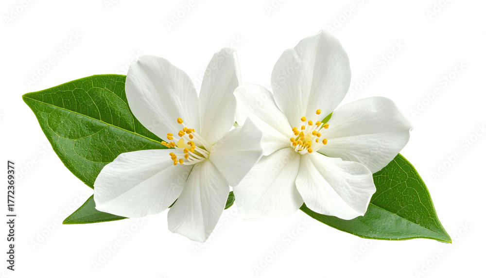 Kwiaty - Two white flowers bloom with yellow centers and green leaves #1772369377