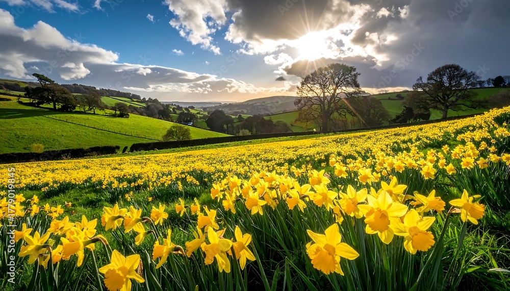 Kwiaty - Vast field of daffodils under a dramatic sky #1779019845