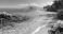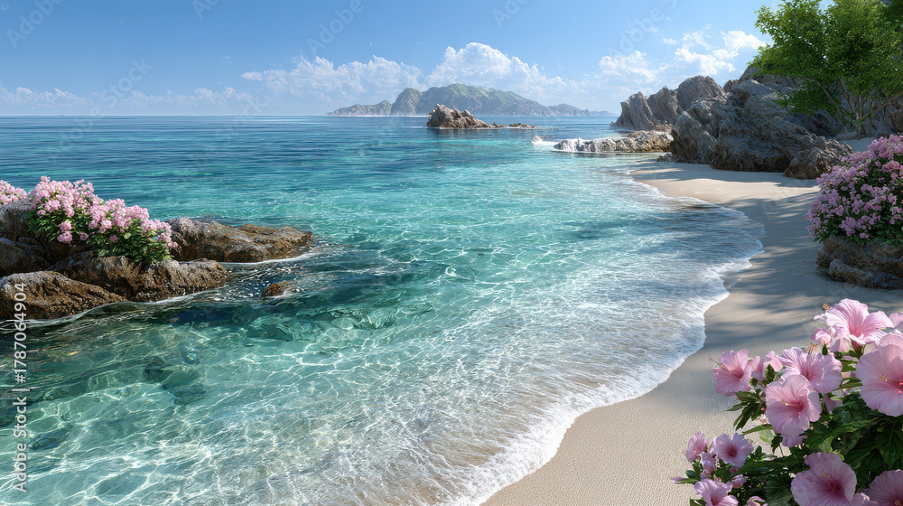 • Serene beach scene featuring clear turquoise water, gentle waves, and vibrant pink flowers along shore. landscape includes rocky formations