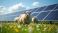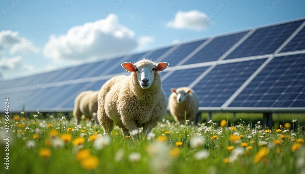 • Sheep graze in solar farm. Renewable energy source with animal agriculture synergy. Green eco grass field with flowers and blue photovoltaic panel array. Nature sustainability solution.