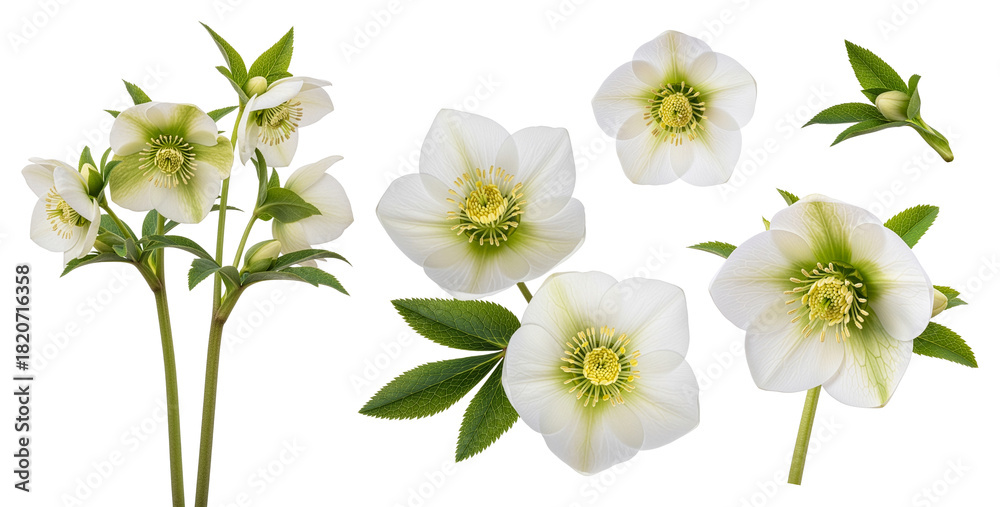 • White Christmas rose (Helleborus niger) flowers, buds, and green leaves isolated on transparent background.
