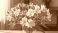 • A colorful bouquet of mixed flowers in a vase on a wooden table.