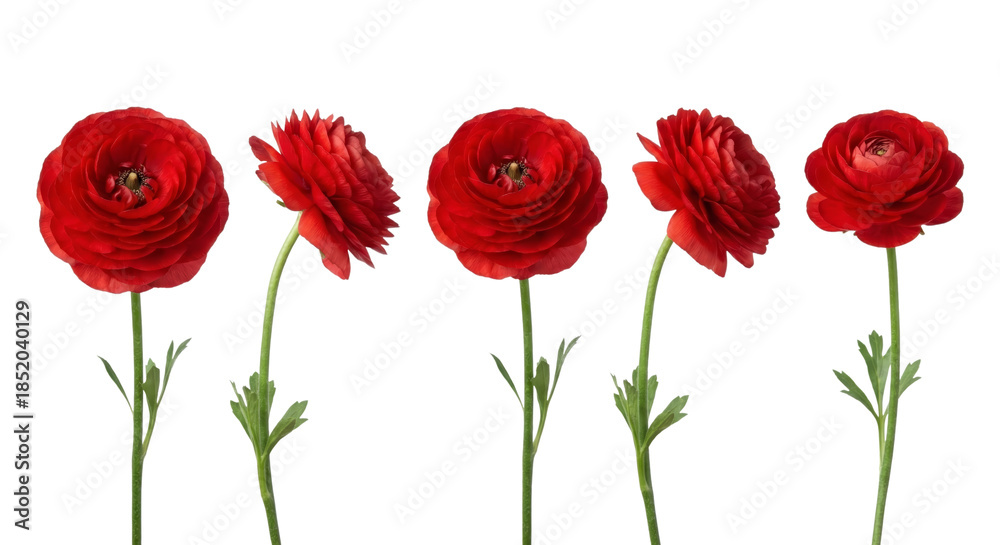 • vivid red ranunculus flowers arranged in a row isolated on a transparent background