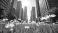 • Field of daisies grows in urban park between tall skyscrapers. Green grass and bright white flowers bloom in city center. Nature thrives among modern buildings.