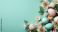• Colorful Easter eggs sit among flowers on a light blue background. The scene captures the spirit of spring and the joy of the Easter season with natural elements.