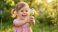 • Happy little girl offering a bunch of daisy flowers in a sunny garden. Cute child smiling and holding a bouquet in nature during spring