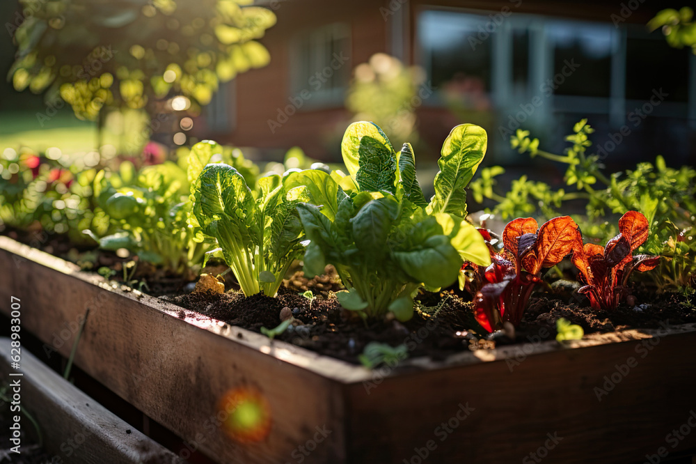 • Wooden raided beds in modern garden growing plants herbs spices vegetables and flowers near a wooden house in the countryside