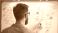 • Bearded man works on whiteboard planning user experience. He organizes colorful sticky notes to map out a tech project, digital design, and business strategy. He develops new product processes.