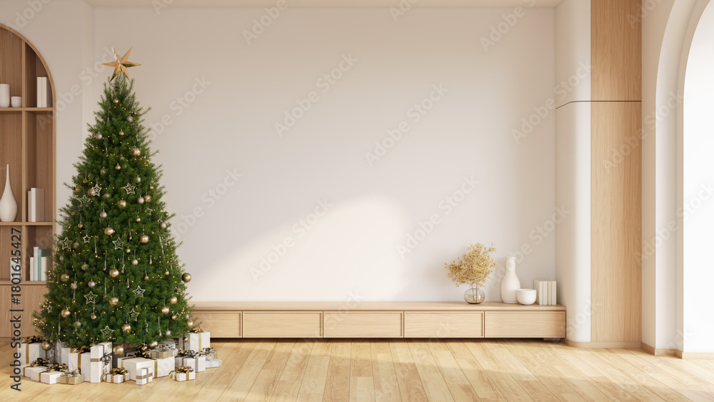 • Living Room Interior with Christmas Tree Background, Christmas Interior Mockup with Copy Space Wall .wood tv cabinet..3D render