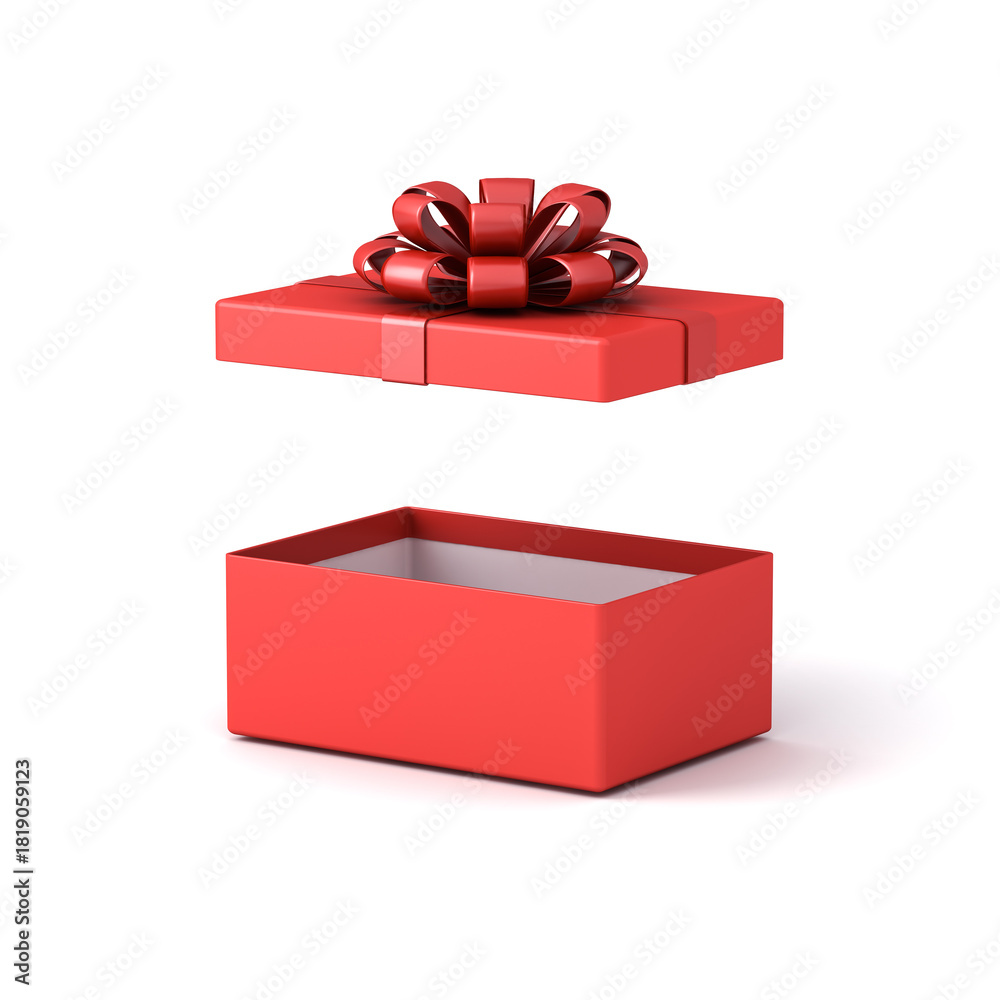 • Red present box open with white inside product display mock up showcase or blank red rectangle gift box with red ribbon bow isolated on white background with shadow creative idea concepts 3D rendering