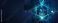 Abstract christmas tree forming from golden particles on a dark blue background with bokeh and copy space