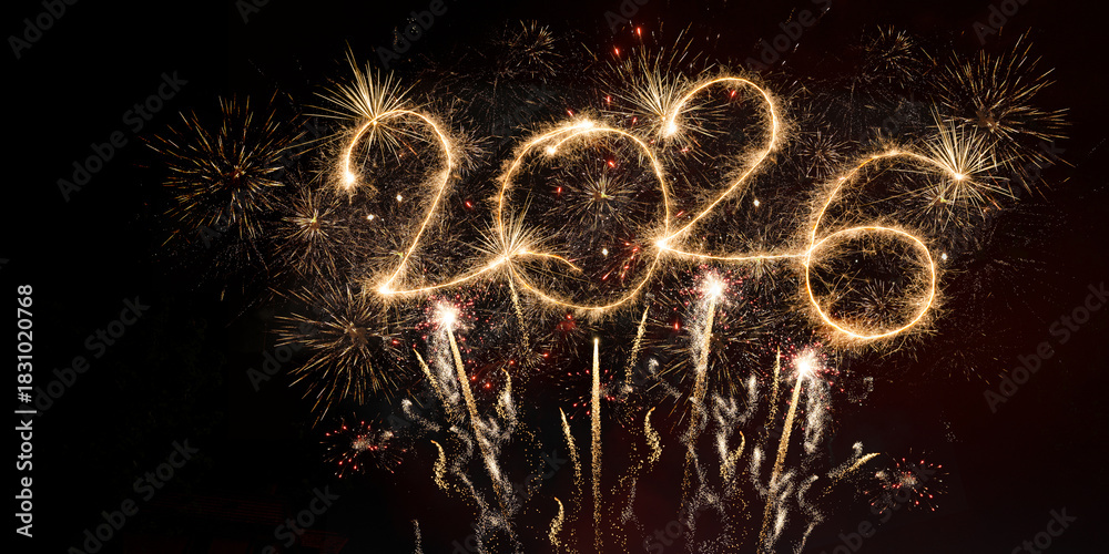 • happy new year, new year's eve, silvester, new year, celebration greeting card, new year card - Year 2026 in sparkler font and firework fireworks pyrotechnic, isolated on black night sky background