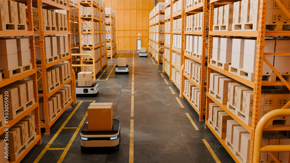 Rośliny - Automated warehouse logistics center with autonomous robots moving cardboard boxes. Smart supply... #1903005920
