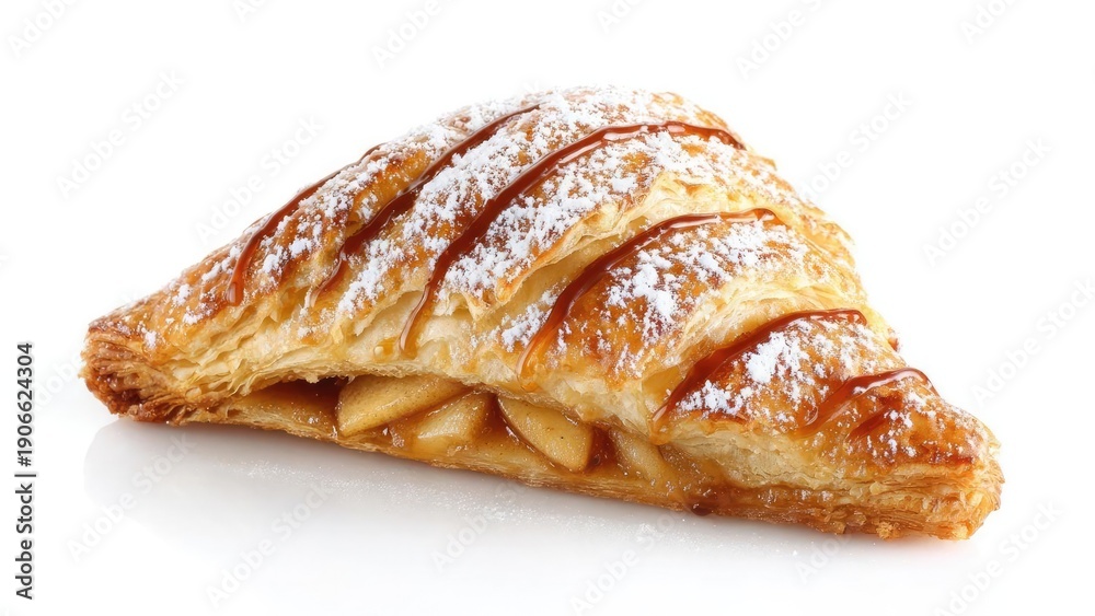 • A triangular puff-pastry apple turnover, dusted with powdered sugar and drizzled with caramel. Concept Dessert, Pastry, Apple Turnover, Caramel Drizzle, Powdered Sugar