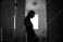 • silhouette of tired woman leaning against wall in bathroom, stress and mental health concept