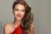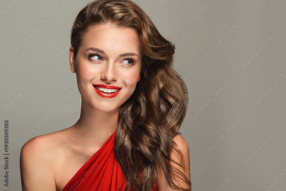 • A slender and elegant woman with a beautiful smile. She is wearing a red dress and red lipstick. The girl's hair is styled in a wavy hairstyle. Curly hair, cosmetology, beauty, and makeup.