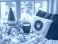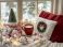 • Czerwony kubek z kawą obok świątecznych poduszek i okna