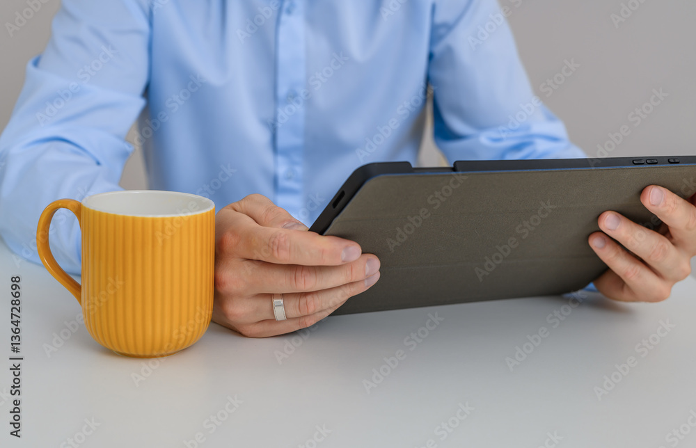 Kawa - Mężczyzna w pracy przy biurku, korzystać z laptopa i pije herbatę #1364728698
