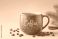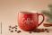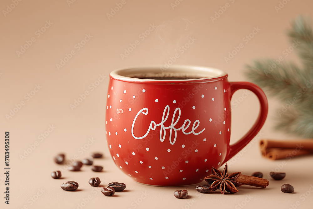 • Czerwony, świąteczny kubek z napisem "Coffee" i białymi kropkami, wypełniony kawą i otoczony ziarnami, cynamonem i anyżem, na tle beżowym, z parą.